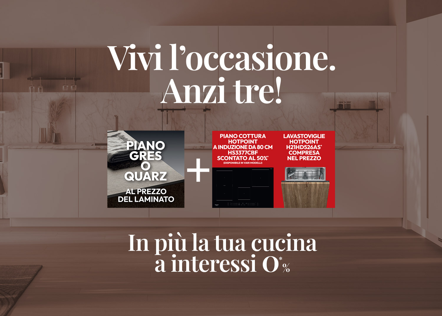 Il piano in Gres o Quarz è al prezzo del laminato, la lavostoviglie Hotpoint è compresa nel prezzo e il piano cottura Hotpoint è scontato al 50%...In più la tua cucina a interessi 0%**!